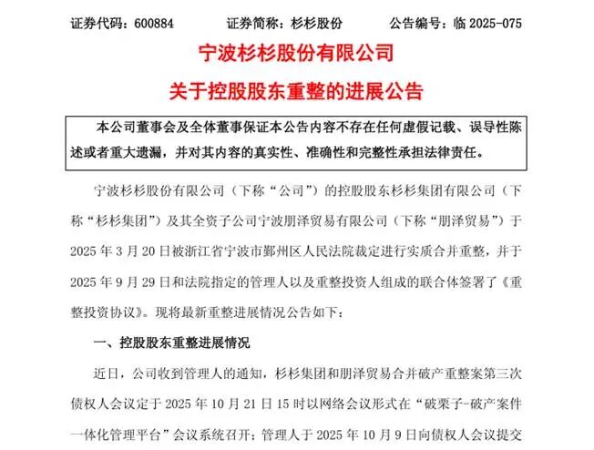 近日,杉杉股份发布公告称,杉杉集团、朋泽贸易、管理人与新扬子商贸、新扬船、TCL产投、东方资管深圳分公司等重整投资人组成的联合体签署了《重整投资协议》,并将于10月21日召开第三次债权人会议对该草案进行表决。