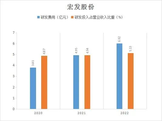 从研发方面看,宏发股份近年来投入增速加快,2020年到2022年研发费用分别为3.81亿元、4.95亿元、6.02亿元,研发费用占营业收入占比分别为4.87%、4.94%、5.13%。专利方面,截至2022年底,宏发股份已获得专利授权1813项,其中发明专利408项,国际专利116项,各项数据均位居行业领先。可以看出,宏发股份对于研发的重视程度越来越高,未来对于构建产品护城河和其市场竞争力将起到有效作用。