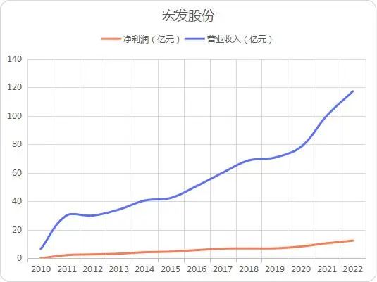 值得注意的是,宏发股份的业绩是呈现持续的增长状态,自2010年以来的营业收入和净利润基本保持稳定增长。2022年与2010年相比,12年已翻了123倍,增速非常惊人。