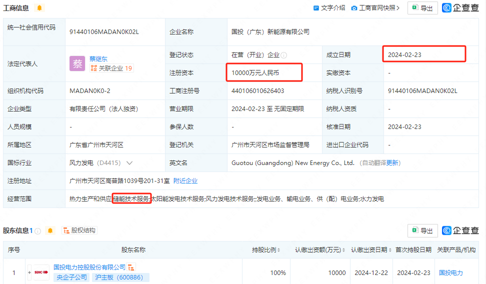 国投(广东)新能源有限公司于2月23日成立,注册资本1亿元,经营范围:热力生产和供应;储能技术服务;太阳能发电技术服务;风力发电技术服务;;发电业务、输电业务、供(配)电业务;水力发电。