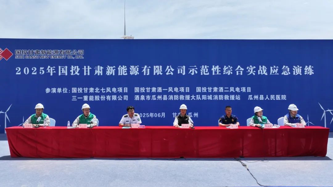 6月5日,国投甘肃新能源在北七风电项目成功举行了综合实战应急演练活动。国投甘肃新能源瓜州区域3个项目、瓜州县消防救援大队等7家单位共50余人参与,国投电力有关负责同志、相关部门、国投电力板块20余家发电企业3000余人通过线上直播进行了观摩。