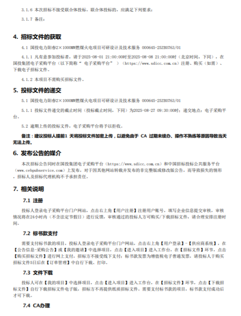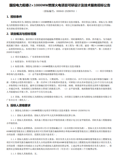 8月1日,国投集团电子采购平台发布国投电力阳春2×1000MW燃煤火电项目可研设计及技术服务公开招标公告,详情如下: