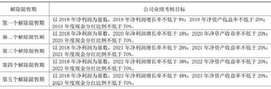 根据考核管理办法,2019-2023年公司业绩达到以下目标时,限制性股票方可解除限售。具体考核目标如下: