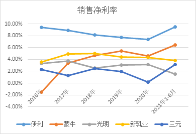 尽管伊利近两年在广告营销上支出更多,伊利近几年的销售费用率却一直低于蒙牛(蒙牛在渠道开拓上支出较多),伊利总体期间费用率也更低。通过提效降费,伊利的销售净利率大幅高于其他同行。