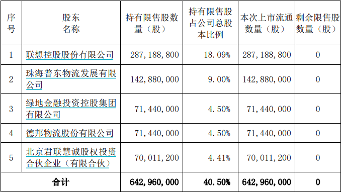 此次解禁股东包括五位,其中占比最大股东为联想控股,持股股量2.87亿股,占总股本的18.09%。另有珠海普东物流发展有限公司、绿地金融投资控股集团、德邦物流和北京群联慧诚股权投资合伙企业(有限合伙)。