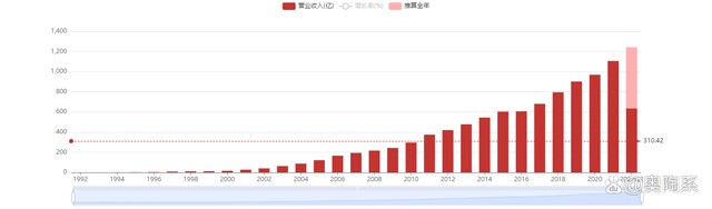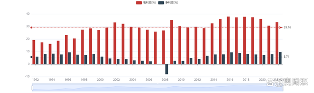伊利股份从1992年至2021年,营业收入从0.34亿元增长至1106亿元,29年增长3252倍,接近30年保持全部正增长,实在是非常令人不可思议,A股中这样的公司找不到几家,2022年中报显示实现营业收入634.6亿元,同比增长12.3%。净利润同期由200万元增长至87.05亿元,29年增长4352倍,2022年中报显示实现净利润61.33亿元,同比增长15.24%。29年中只有2007年、2008年亏损,其余年份全部实现盈利,且均保持高速正增长。实在是非常了不起。