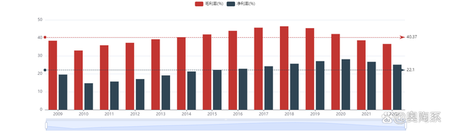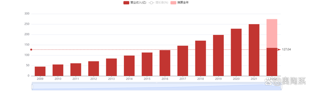 海天味业从2009年至2021年,营业收入从44.83亿元增长至250亿元,12年增长4.5倍,12年保持全部正增长,和伊利股份一样,2022年中报显示实现营业收入135.3亿元,同比增长9.73%。净利润同期由7.07亿元增长至66.71亿元,12年增长8倍,2022年中报显示实现净利润33.93亿元,同比增长1.19%,有放缓迹象。