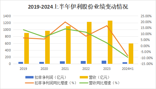 2024年上半年,伊利股份实现营收599.2亿元,同比减少9.5%,实现扣非净利润53.24亿元,同比减少8.2%,打破了业绩正增长的趋势。