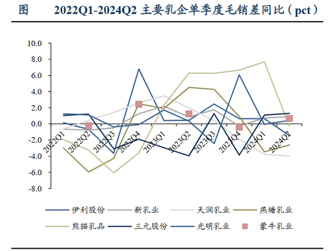 从数据上看,2024年二季度仅有新乳业、光明乳业的销售费用率同比下降,其他乳企像伊利、天润、燕塘等都因为加大了费用投放力度而导致毛销差同比下降。