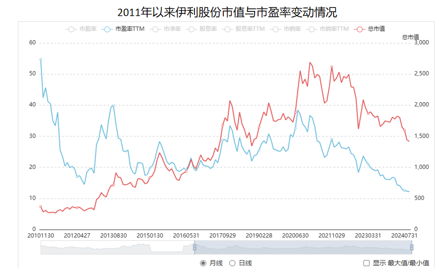 不过从短期来看,目前伊利的市盈率已经来到了近十年以来的较低位置,存在一定的修复空间。