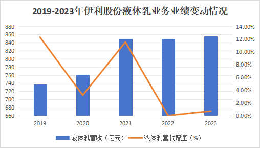 2021-2023年,伊利液态奶业务营收分别实现849.1亿元、849.3亿元和855.4亿元,三年仅增长了6.3亿元。