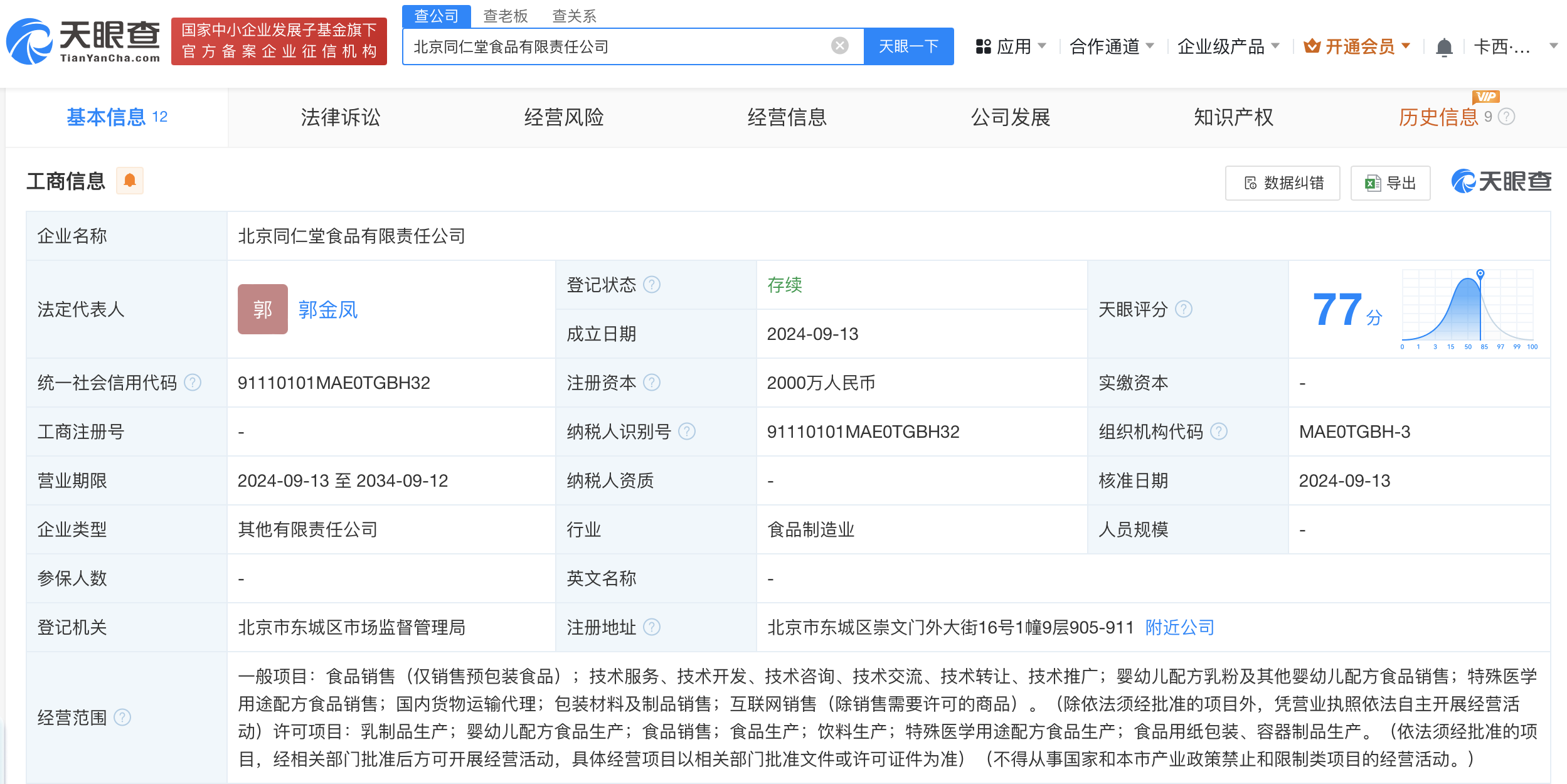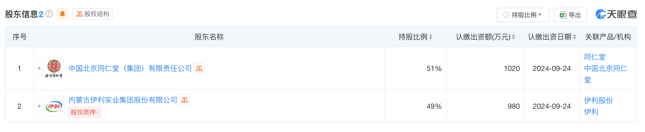 近日,北京同仁堂食品有限责任公司成立,法定代表人为郭金凤,注册资本2000万人民币,经营范围含乳制品生产、婴幼儿配方食品生产、食品销售、食品生产、饮料生产等。股东信息显示,该公司由中国北京同仁堂(集团)有限责任公司、伊利股份(600887)共同持股。