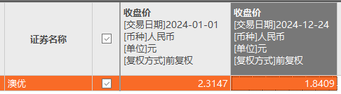 从股价表现来看,东方财富显示,截至2024年12月24日,澳优前复权的股价为1.84元/股,相较年初的2.31元/股,下跌了20.35%。