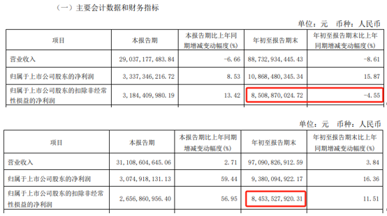 另外,伊利股份2024年前三季度归母净利润虽然同比增长15.87%,但主要是受非经常性损益的影响。从扣非后归母净利润来看,伊利股份2024年前三季度为同比下降4.55%。
