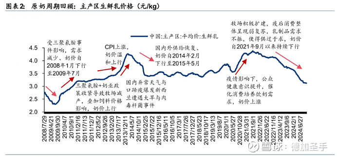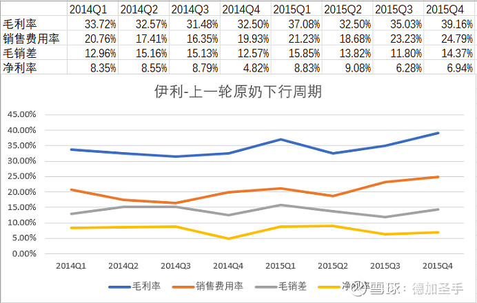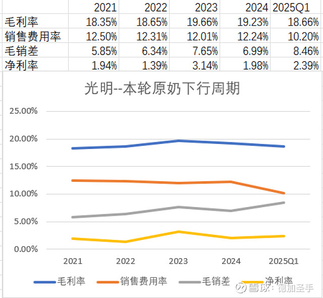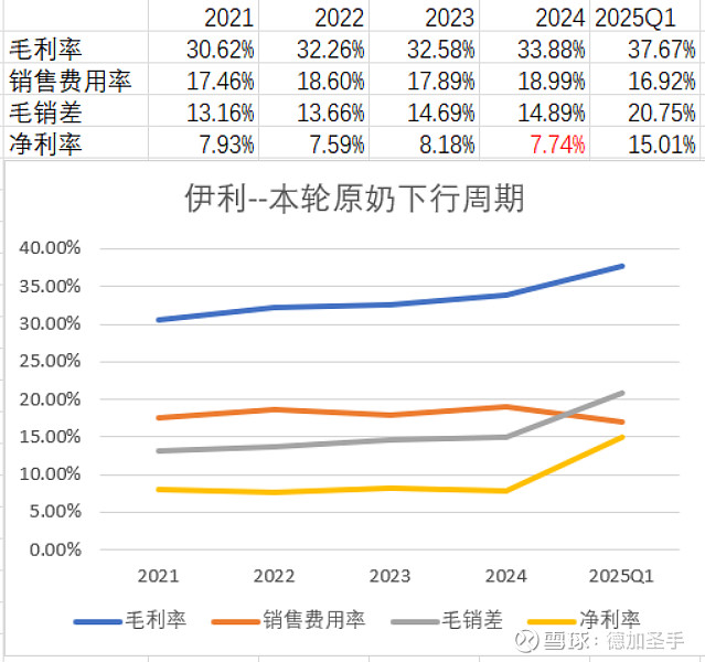 我觉得可以看到这几点: 1、毛利率有一定滞后性,虽然原奶价格下降会带来毛利率上行,但数据看上一轮下行周期里,毛利率先降(怀疑是随着原奶价格前端在降价),直到2025Q1原奶最低位,毛利率大幅反弹,推测是价格战打了一年,都不想继续降了,所以价格不变,原材料成本下降,带来毛利率阶段性提升,1季度也可能是春节因素,需求好,所以不降价,春节后过后2季度继续价格战,毛利率又大幅回落,然后随着原奶走出底部,2015Q3和Q4不再降价销售,并且这个时候应该是安慕希开始发力,价格带整体上行,带动毛利率大幅提升。