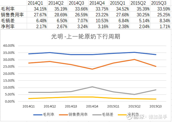 再看这轮原奶周期的数据。相对而言,即使一个是季度的比率,一个是年度的比率,但比率这个东西我觉得还是至少在趋势上是有可比性的,不是直接比较绝对值就好: