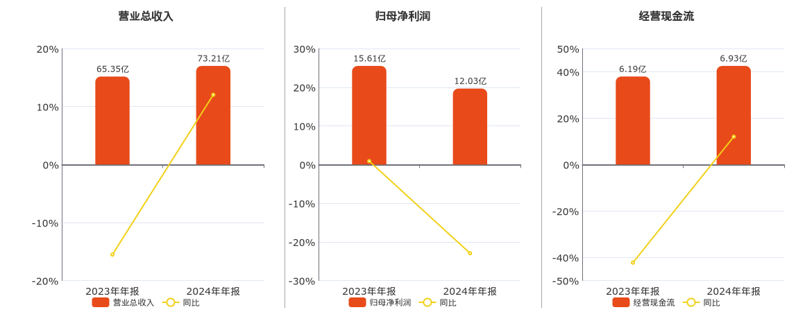 公司营业总收入为73.21亿元。归母净利润为12.03亿元,较去年同报告期归母净利润减少3.58亿元,同比较去年同期下降22.94%。经营活动现金净流入为6.93亿元。
