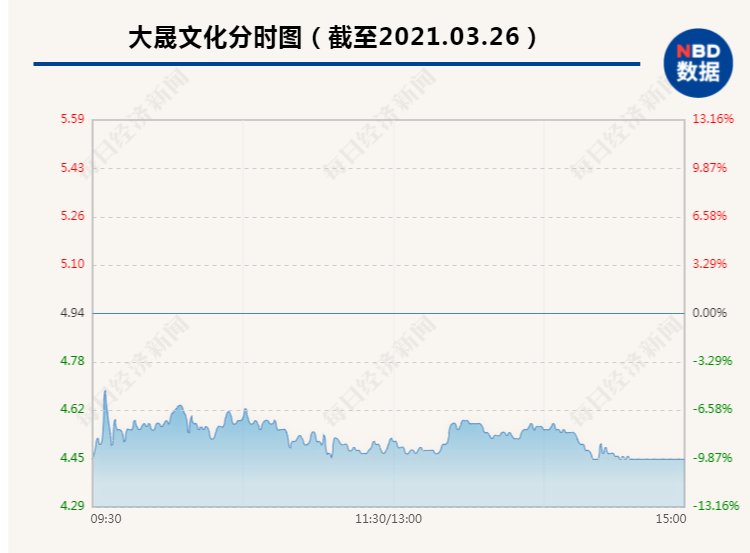 3月26日,大晟文化(600892,SH)今日早盘大幅低开后并未随大盘上涨拉起,反而是大跌横盘震荡,尾盘被大单摁死跌停。截至收盘,该股报收4.45元,暴跌9.92%跌停,成交1.44亿元,最新市值为24.90亿元。