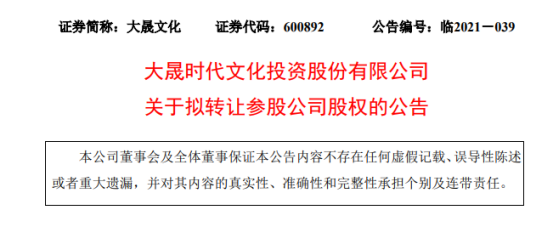 对于1元转让价的解释,大晟文化在公告中称,本次交易在结合康曦影业经审计的财务数据基础上,综合考虑目前康曦影业经营不善、员工流失、资不抵债等因素,经交易双方协商确定本次转让价格为 1 元。