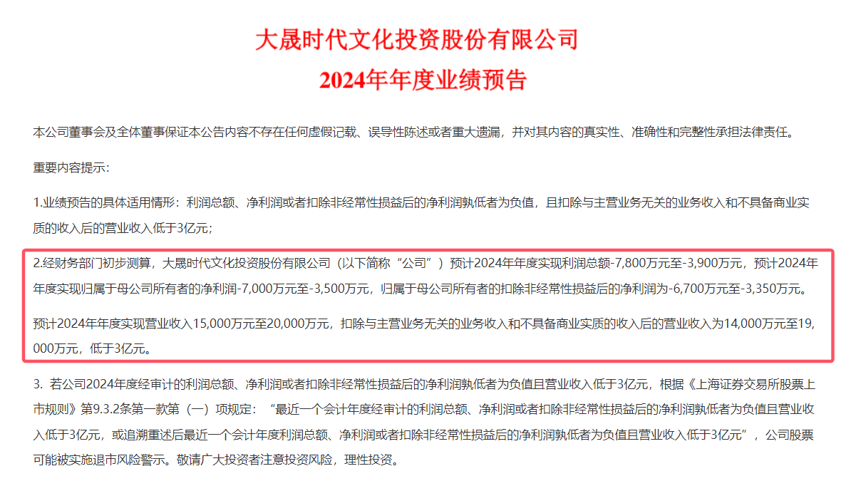唐山文旅入主后,虽然试图通过借款等方式支持大晟文化的运营,但短期内效果并不明显。2024年初至今,大晟文化的股价持续下跌,从收购时的7.35元/股跌至最近的3.43元/股,跌幅近50%。更令人担忧的是,根据2024年的业绩预告,公司预计亏损且营业收入低于3亿元,触及退市风险警示情形。这意味着,一旦年报披露,大晟文化或将披星戴帽。