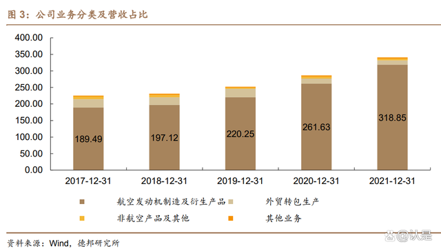 公司主要业务分为三类:航空发动机及衍生产品业务、外贸出口转包业务、非航空产品及其他业务。主要产品和服务有航空发动机及燃气轮机整机、部件,维修保障服务以及航空发动机零部件出口转包等。公司主要业务为航空发动机制造及衍生产品,2021 年营收占比为 93%,近 5 年来占比均在 84%以上,是公司收入的主要来源。