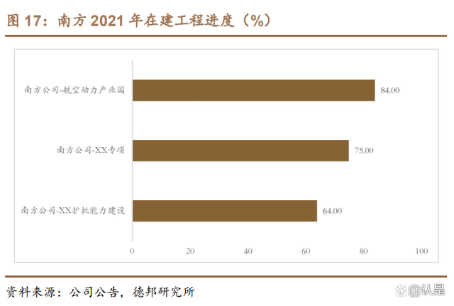 公司旗下四大主机厂自 2019 年起陆续以国拨及自筹等方式进行了新一轮的产能扩充,大部分项目已进入尾声阶段。截至 2021 年末,公司重点在建工程 18 项,其中 4 个项目工程进度已达 99%及以上,有 5 个项目工程进度在 75%—99%之间。此外,黎阳动力三代中等推力航空发动机生产线建设项目和南方公司涡轴航空发动机修理能力建设项目分别已于 2019 年和 2021 年竣工,公司目前已能够批量生产第三代航空发动机。受益于国防军队现代化加速发展,客户对三四代先进军机需求急速上涨,为配套航空发动机带来的更为广阔的市场空间,公司作为国内唯一基本覆盖三四代战机配套发动机的供应商,有望充分享受行业增长红利。