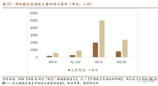 关键假设 9:航空发动机维修空间测算Ⅰ.航空发动机的全生命周期中,维护阶段所需的费用占比为 45-50%左右,与采购费用接近,我们预计 2022-2035 年航空发动机采购费用和运营维护费用之比为 1:1。Ⅱ.战斗机因为需要经常性承受大机动大过载,教练机因为训练强度较大,这两种机型对发动机消耗较大,预计其发动机 2 年大修一次,其余机型发动机则三年大修一次。随着练兵备战常态化,发动机损耗加速,大修次数逐渐增加至 3 次,我们按照每台发动机大修 3 次预估,每次大修价值量约在整机价值量的 1/3 左右。