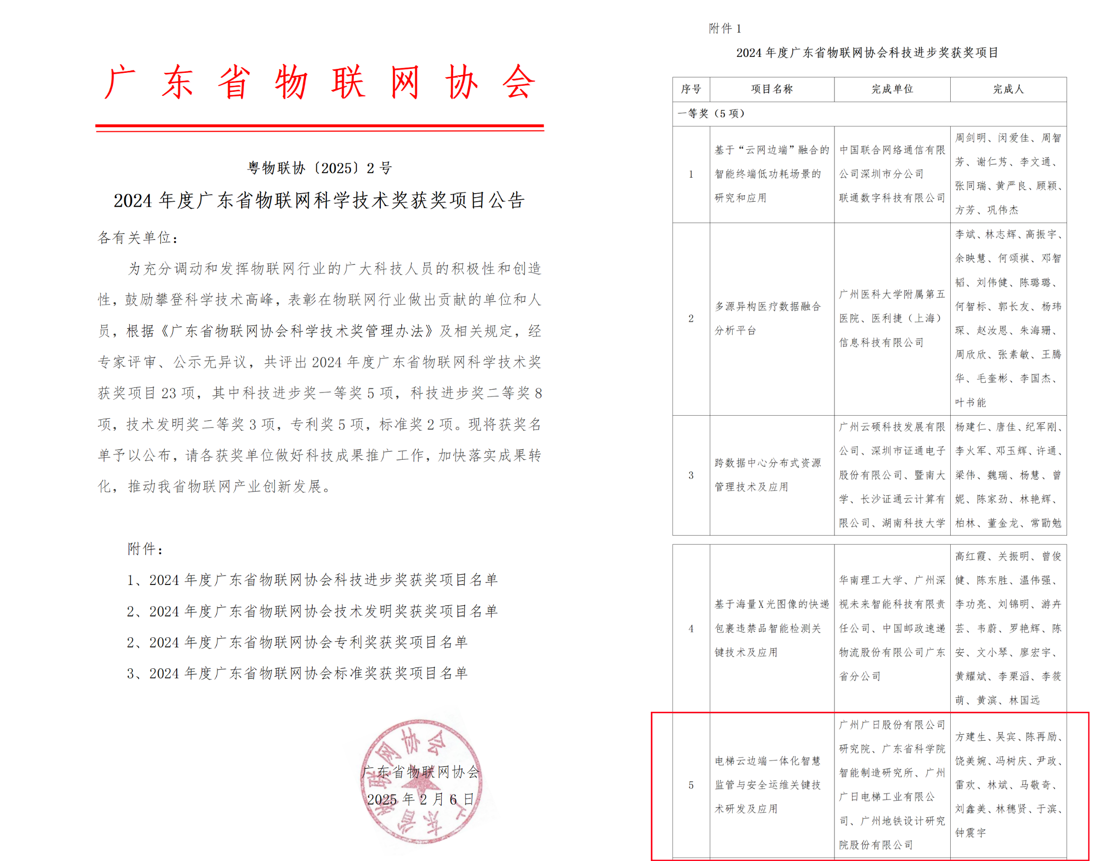 近日,广日股份研究院“电梯云边端一体化智慧监管与安全运维关键技术研发及应用”项目科技成果荣获2024年度广东省物联网协会科技进步奖一等奖。该项目是广日股份研究院、广东省科学院智能制造研究所、广日电梯、广州地铁设计研究院共同推进的产学研合作项目。项目技术成果经广东省物联网协会评定,整体技术处于国际先进水平,其中在电梯边缘端智算盒子的数据加密方面处于国际领先。