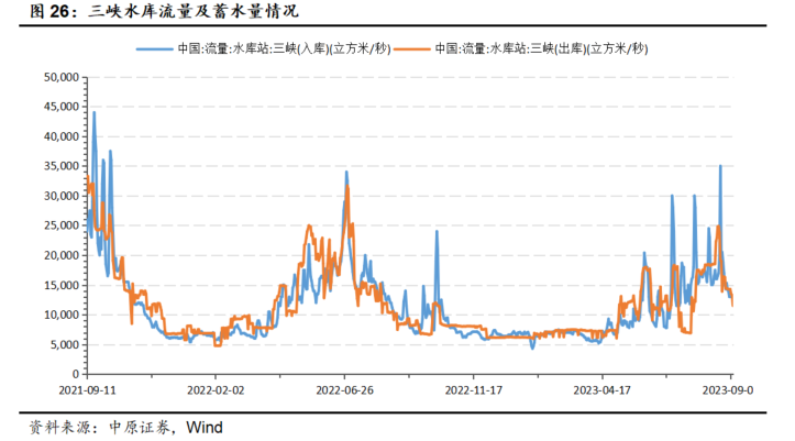 根据公司公告,进入2023年三季度,特别是8月以来,受长江来水逐步转多影响,公司六座梯级电站日发电量逐步增加,其中单日最大发电量超14亿千瓦时,单日发电量同比偏多6成左右。预计汛期整体来水较去年同期明显偏东翼。截止8月28日,公司所属梯级水库蓄水量约200亿立方米,同比偏多近160亿立方米,上游其他流域梯级水库蓄水量也好于2022年同期。当前乌东德、三峡等水库来水均较2022年同期明显偏丰,其中乌东德天然来水基本接近多年均值水平。受六库联合调度效益逐步显现、以及降水和水库存水同比偏多等因素影响,预计2023年下半年公司所属六座梯级电站发电量将较2022年同期显著增加。