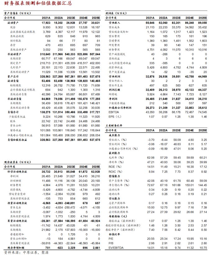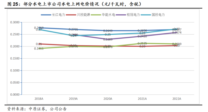 上网电价:公司2019-2022年平均上网电价在0.27元/千瓦时(含税)附近波动,随着市场化交易电量占比的上升,水电电价的竞争力会逐步体现。公司白鹤滩电站外送高电价的确定,及乌、白电站向高电价地区输送的电量占比提升,利于公司整体上网电价的提升。2023年二季度公司营收下滑幅度低于发电量下滑幅度,以及2023年以来全国水电出力出现较大幅度下滑,根据公司业绩表现及供需关系等因素,我们推测2023年上半年公司平均上网电价已经有所提升。我们保守假设2023-2025年公司水电上网电价分别为0.2790、0.2730、0.2760元/千瓦时(含税)。