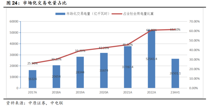 我国市场化交易电量占比不断上升。2022年1月,国家发展改革委、国家能源局《关于加快建设全国统一电力市场体系的指导意见》提出,到2025年,全国统一电力市场体系初步建成;到2030年,全国统一电力市场体系基本建成。随着电力市场化改革的持续推进,2017年以来市场交易电量占比逐年大幅增加。2022年市场化交易电量5.25万亿千瓦时,占全社会用电量比重为60.8%;2023年上半年,市场化交易电量2.65万亿千瓦时,占全社会用电量比重为61.5%。