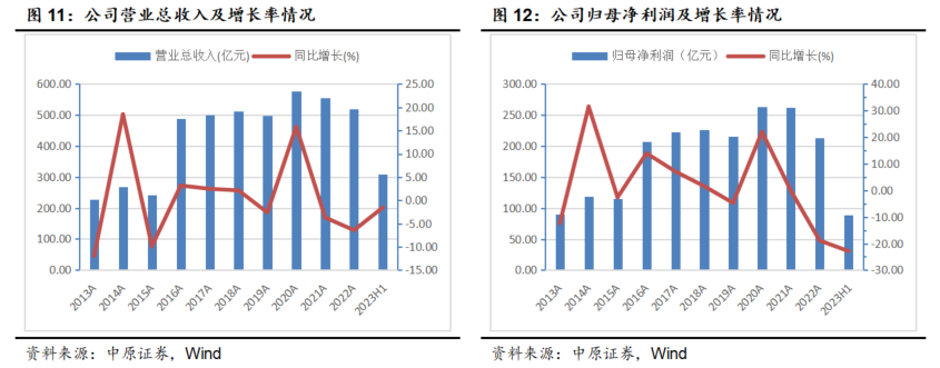 公司自成立以来业绩持续稳定增长。自2003年成立,至2022年,公司装机容量由551万千瓦增至7179.5万千瓦,营业总收入由29.86亿元增至520.60亿元,归属于上市公司股东的净利润由14.38亿元增至213.09亿元。2023上半年,长江来水同比偏枯、运行水位偏低(梯级水库持续向下游补水),公司六座梯级电站总发电量约1032亿千瓦时,其中第二季度,公司境内所属梯级电站总发电量约476.16亿千瓦时,较2022年同期减少38.33%。在发电量较大幅度下滑的背景下,2023上半年,公司实现营业总收入309.75亿元,同比下降1.54%;实现属于上市公司股东的净利润88.82亿元,同比下降22.85%。