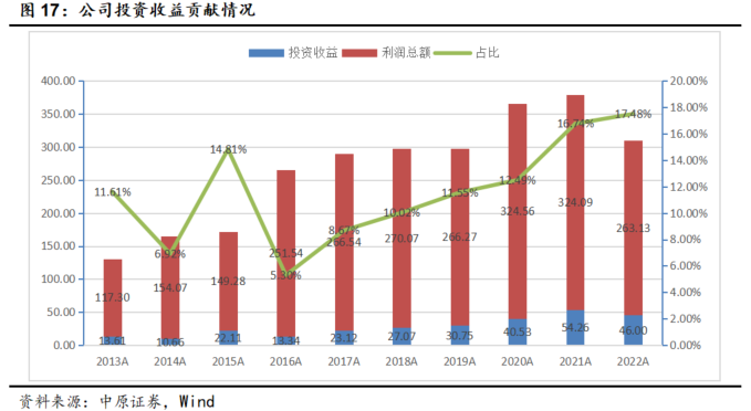 公司持续获得稳定投资收益。2019年以来,公司年投资收益维持在30亿元以上,占利润总额的比例超过10%,能够在一定程度上平滑外界不利因素对公司经营业绩的影响。