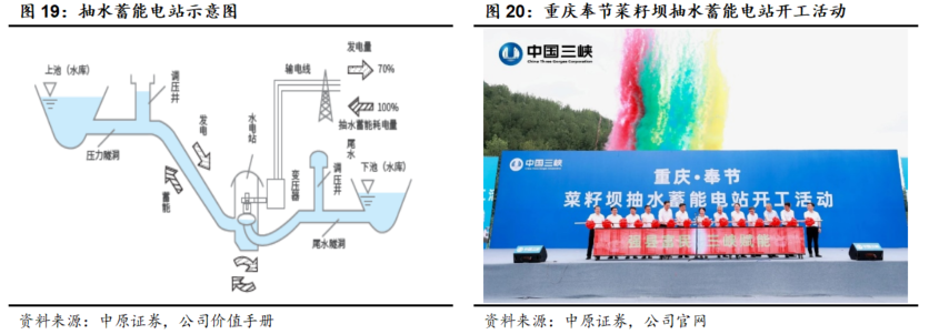 公司有序布局抽水蓄能业务。目前,公司锁定抽蓄项目资源约4000万千瓦,其中甘肃张掖抽水蓄能电站与重庆奉节菜籽坝抽水蓄能电站均为《国家抽水蓄能中长期发展规划(2021-2035)》“十四五”重点实施项目。2022年10月,公司首座抽蓄电站甘肃张掖抽蓄电站举行开工活动,计划安装4台单机容量35万千瓦的可逆式水泵水轮机组,总装机140万千瓦,电站预计2028年实现首台机组投产发电,2029年全部机组投产发电。2023年6月,公司重庆奉节菜籽坝抽水蓄能电站举行开工活动,以推动库区乡村产业结构升级和能源转型。菜籽坝抽水蓄能电站位于重庆市奉节县兴隆镇及冯坪乡境内,为日调节纯抽水蓄能电站,设计安装4台单机容量30万千瓦的立轴单级混流式水泵水轮发电机,计划2029年首台机组投产发电。