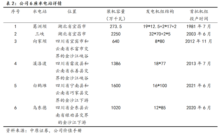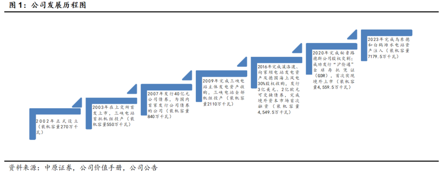 公司为A股最具影响力的电力上市公司之一。2002年9月,公司由中国长江三峡集团有限公司作为主发起人设立,2003年11月在上交所首发上市。2020年9月,公司发行的“沪伦通”全球存托凭证在伦敦证券交易所上市交易。公司主营水力发电业务,是我国最大的水电上市公司和全球最大的水电企业。2023年1月,公司完成乌东德、白鹤滩水电站资产注入,全资拥有长江干流6座梯级电站的全部发电资产,总装机容量增加至7179.5万千瓦,增长约58%。截至2023年9月12日,公司市值5400亿元,在A股电力上市公司中排名第一。