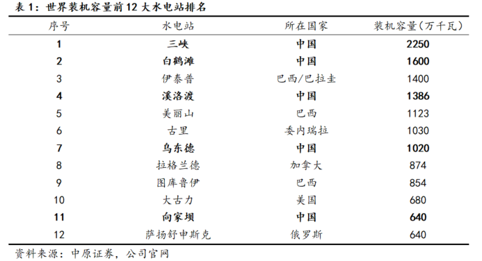 公司有5座大型水电站跻身全球前12。在全球装机容量排名前12的大型水电站中,公司有5座水电站上榜,其中三峡水电站排名第1,白鹤滩水电站排名第2,溪洛渡水电站排名第4,乌东德水电站排名第7,向家坝水电站排名第11。
