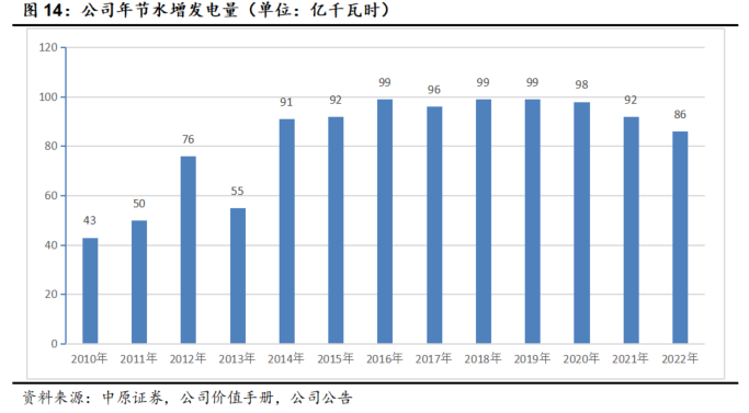 发电量:水电发电量受来水及水位情况影响,而来水情况受气候变化情况影响较大。2021、2022年受气温干旱等因素影响,长江流域来水持续偏枯,公司2021、2022年发电量分别同比减少8%、11%。2023年上半年,长江来水继续偏枯,长江上游乌东德水库、三峡水库来水总量较2022年同比减少23%、30%,溪向三葛四座电站发电量同比减少26.1%。尽管来水减少,我们仍对公司发电量情况保持乐观。一是来水量随季节变更丰枯交替,受益于雨季汛期及厄尔尼诺现象重现等因素,进入三季度后,长江来水已逐步转多;二是公司由“四库联调”提升为“六库联调”后,装机容量不仅实现较大幅度提升,年节水增发电量也提升至60-70亿度,这些因素都有利于公司发电量的增多;三是2023上半年,我国水电发电量整体下滑22.90%,其中6月份发电量同比下降33.90%,而7月份发电量同比下降17.50%,降幅已经明显收窄。