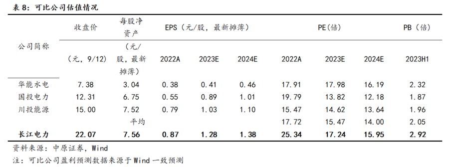 我们认为,水电资产优质稀缺,是在我国电力供应系统中占比最高的可再生能源。公司作为我国最大的水电上市公司和全球最大的水电企业,在资本市场具有重要的标杆作用。虽然在2023年上半年面临着长江来水偏枯的不利局面,在乌、白电站资产注入后,公司将受益于“六库联调”带来发电量及业绩稳定性的提升。预计公司2023-2025年归属于上市公司股东的净利润分别为313.27亿元、338.53亿元、356.12亿元,对应每股收益分别为1.28元、1.38元、1.46元,按照9月12日22.07元/股收盘价计算,对应PE分别为17.24倍、15.95倍、15.16倍。根据可比上市公司PE情况,公司PE处于合理估值区间。综合考虑公司盈利能力和高分红比例,以及在电力及公用事业行业的龙头地位和所处行业前景,首次覆盖,我们给予公司“增持”投资评级。