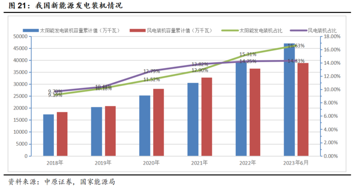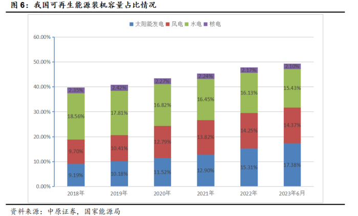 我国新能源发电装机持续高速发展。根据国家能源局统计,我国风电、太阳能发电,分别连续13年、8年稳居全球装机首位。截至2023年上半年末,我国太阳能发电和风电装机占比已超过31%。2023年6月,水电水利规划设计总院和中国水力发电工程学会抽水蓄能行业分会联合发布的《中国可再生能源发展报告2022》显示,“十四五”期间,预计我国可再生能源将继续保持快速增长势头,可再生能源发电量在全社会用电量中的占比达到约33%,电力装机增量预计超过一半来自风电和光伏。目前,全国大型风电光伏基地项目全面推进,第一批项目已全面开工,计划2023年年底前全部建成并网。在“双碳”目标引领下,可再生能源将继续保持快速增长态势,为能源电力绿色低碳转型奠定坚实基础。