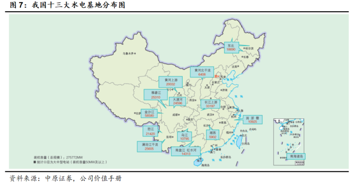 天然垄断,水电资产优质稀缺。我国水能资源位居世界首位,为全球最大的水电生产国,水电是在我国电力供应系统中占比最高的可再生能源。我国十三大水电基地总装机规模达到2.75亿千瓦,正在开发和将开发的水电站中,装机500万千瓦以上水电站增量近乎为零。大型水电站调峰能力强,能有效缓解电力负荷中心用电紧张局面。