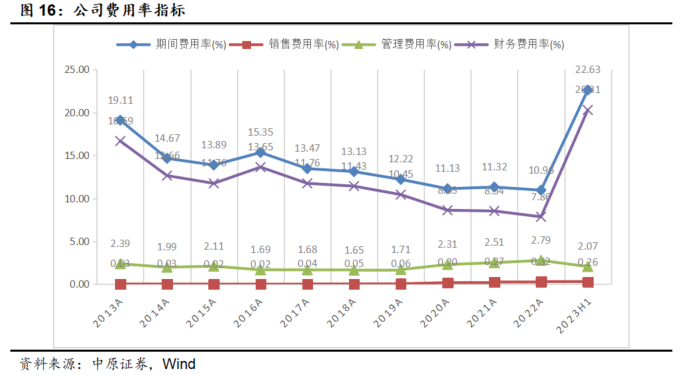 公司信用等级高,融资成本低。公司常年维持境内AAA级和穆迪A1级、惠誉A+级国际信用评级,并获伦交所“绿色经济标志”认证。公司融资品种涵盖了我国资本市场主流融资品种。2022年,公司新增债券成本为2.89%,较2020、2021年有所下降。公司期间费用主要为财务费用,随着债务规模和融资成本下降,2013-2022年,公司整体期间费用率处在下降趋势。2023年上半年,公司期间费用率出现了较大幅度增长,增至22.63%,主要是由于财务费用率增长至20.31%,因为在并购云川公司后,公司带息负债规模增加,以及利息资本化金额减少,使得同期公司财务费用出现了大幅度增长;而公司管理费用率和销售费用率均有所下滑。