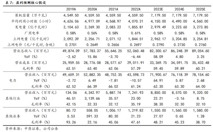 平均利用小时数:2023年来水持续偏枯,但长期来看,来水存在均值回归的趋势,随着水电发电量的回升,根据历史情况和来水变化规律,我们假设公司2023-2025年水电平均利用小时数分别为4150、4490、4560小时,稳步回升。