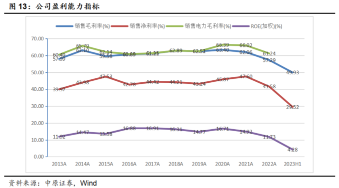 公司经营周期长,盈利能力强且质量高。公司成本主要为资产折旧和贷款利息,随着资产折旧陆续完毕,成本将相应降低,盈利规模将逐步提升。以公司三峡电站为例,2003年8月首批机组投产发电,其中折旧年限为18年的水轮发电机组自2021年起陆续到期,将带来部分业绩增量贡献。此外,挡水建筑物(折旧年限40-60年)等固定资产折旧到期后,电站折旧费用将显著下降,公司价值创造能力将进一步提升。由于独特的商业运营模式,公司具备天然的区域垄断性,公司整体具有较高且相对稳定的毛利率和净利率,公司毛利率维持在60%左右,净利率维持在40%以上。2022年,公司毛利率57.29%,净利率41.58%,加权净资产收益率11.73%;2023年由于来水偏枯,公司毛利率、净利率分别降至49.93%、29.52%。
