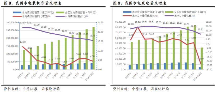 水电是在我国电力供应系统中占比最高的可再生能源。水电是一种成熟的可再生能源技术,是全世界电力系统中非常重要的组成部分,也是主要的清洁电力来源。水电是在我国电力供应中占据重要地位的清洁能源。我国水电已连续18年位居全球装机首位。截至2023年6月底,我国水电装机容量4.18亿千瓦,全国占比15.43%;2023年上半年由于整体来水偏枯,我国水电发电量累计4504亿千瓦时,同比下降22.9%,全国占比下滑至10.81%。
