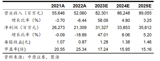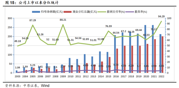 公司坚持高比例分红。公司坚持高分红回报投资者,2003年上市以来公司累计现金分红1628亿元。公司《章程》明确,2021-2025年每年按不低于当年实现净利润的70%进行现金分红,即2025年前分红率不低于70%。2022年公司现金分红金额为200.92亿元,分红率达94.29%,大幅高于70%,股息率4.06%,此次分红金额与分红率均为历年来最高水平。