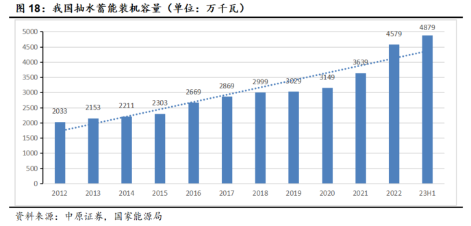 抽水蓄能电站是目前公认最清洁经济的大规模储能设施。抽蓄电站具有调峰、填谷、储能多种功能,启停灵活、反应速度快、调峰能力强,是建设新型能源体系和实现“双碳”目标的重要支撑。2021年,国家能源局发布了《抽水蓄能中长期发展规划(2021-2035年)》,到2025年,我国抽水蓄能投产总规模达到6200万千瓦以上;到2030年,抽水蓄能投产总规模达到1.2亿千瓦。2023年6月,水电水利规划设计总院和中国水力发电工程学会抽水蓄能行业分会联合发布的《抽水蓄能产业发展报告2022》显示,截至2022年底,我国抽水蓄能已建、在建装机规模达到1.6亿千瓦,同时还有接近2亿千瓦的抽水蓄能电站正在开展前期勘察设计工作。其中,已建规模4579万千瓦,约占全球抽水蓄能装机的26.2%,位居世界首位。截至2023年上半年底,我国抽蓄装机规模增长至4879万千瓦。