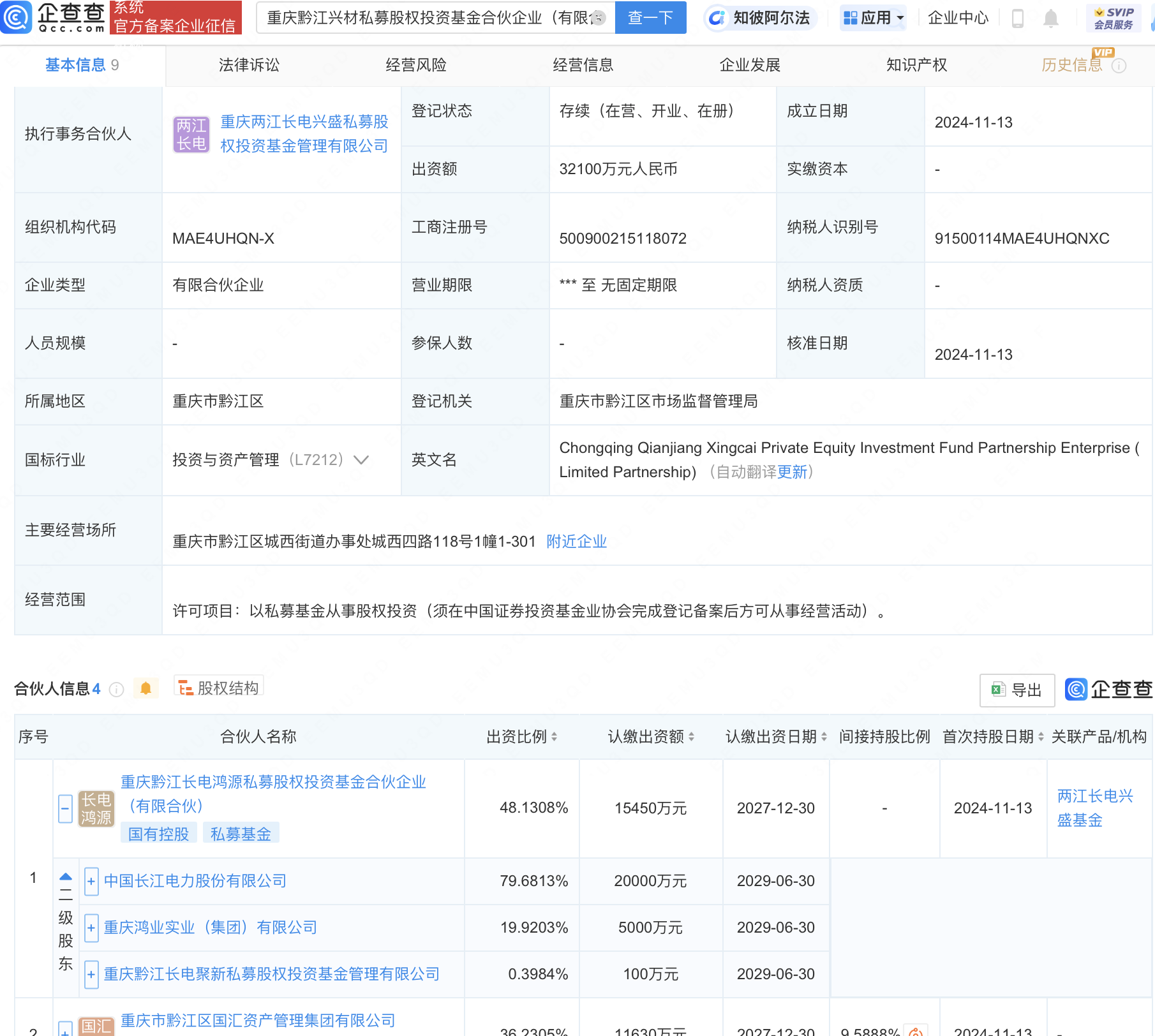 企查查APP显示,近日,重庆黔江兴材私募股权投资基金合伙企业(有限合伙)成立,出资额3.21亿元人民币,经营范围包含:以私募基金从事股权投资。企查查股权穿透显示,该企业由长江电力(600900)旗下重庆黔江长电鸿源私募股权投资基金合伙企业(有限合伙)等共同持股。