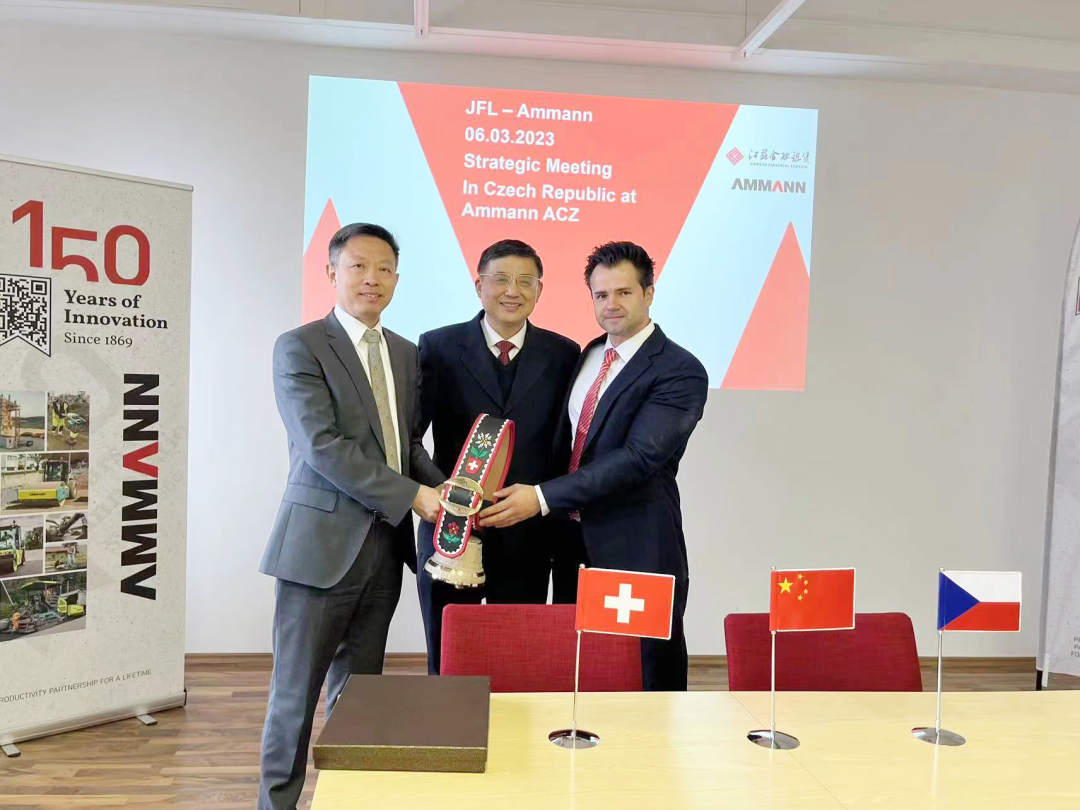 访问团紧接着考察了安迈集团(AMMANN)瑞士总部,参观了安迈捷克工厂。安迈始建于1869年,迄今已有154年历史,是沥青拌和站、压路机、碎石机等道路工程机械领军企业。安迈在全球共有26家分子公司和4个办事处,在100多个国家有超过200个经销商和代理商。2022年,安迈张家港生产基地开工建设,总投资1.2亿美元,预计投产后年销售额超过10亿元。江苏金租与安迈2019年开始合作,是安迈在华最大的金融合作伙伴。