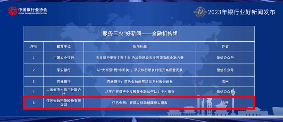 1月30日,由中国银行业协会评定的“2023年银行业好新闻”榜单正式揭晓,江苏金融租赁股份有限公司(以下简称“江苏金租”)报送案例《江苏金租:智慧农机助新疆棉农增收》获评金融机构组“服务三农”好新闻。