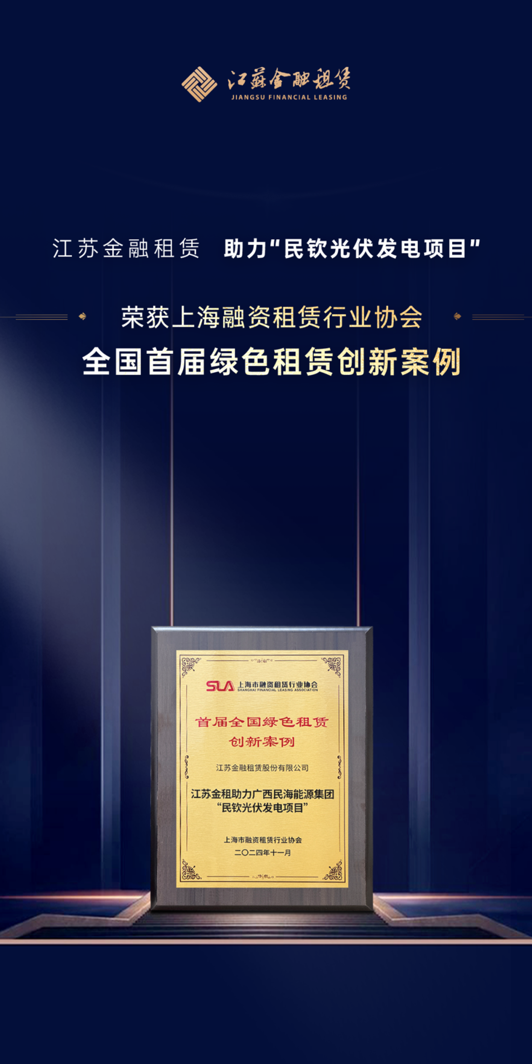 近日,上海市融资租赁行业协会公布首届全国绿色租赁创新案例名单,江苏金融租赁股份有限公司(简称“江苏金租”)助力广西民海能源集团“民钦光伏发电项目”成功入选。此次案例评选活动秉承贯彻绿色发展理念、实施绿色金融战略的宗旨,旨在推动融资租赁行业更好地服务新质生产力,加大对绿色低碳发展的支持。